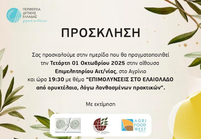 Το Επιμελητήριο Αιτωλοακαρνανίας διοργανώνει Ενημερωτική ημερίδα με τίτλο «Επιμολύνσεις στο ελαιόλαδο από ορυκτέλαια, λόγω λανθασμένων πρακτικών» πραγματοποιείται την Τετάρτη 1η Οκτωβρίου 2025 και ώρα 19:30, στην αίθουσα του Επιμελητηρίου στο Αγρίνιο.