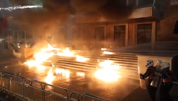 Διαδηλωτές πετούν βόμβες μολότοφ και πέτρες στο κτίριο. Ζητούν την παραίτηση εδώ και τώρα του Έντι Ράμα και της αντιπροέδρου της κυβέρνησης του Μπελίντα Μπαλούκου, τους οποίους κατηγορούν για διαφθορά.