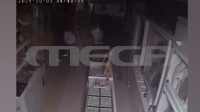 Όπως φαίνεται και στα πλάνα, οι τέσσερις ληστές έσπασαν το ρολό του καταστήματος και εισέβαλαν μέσα στο κοσμηματοπωλείο στο κέντρο της Αμαλιάδας.
