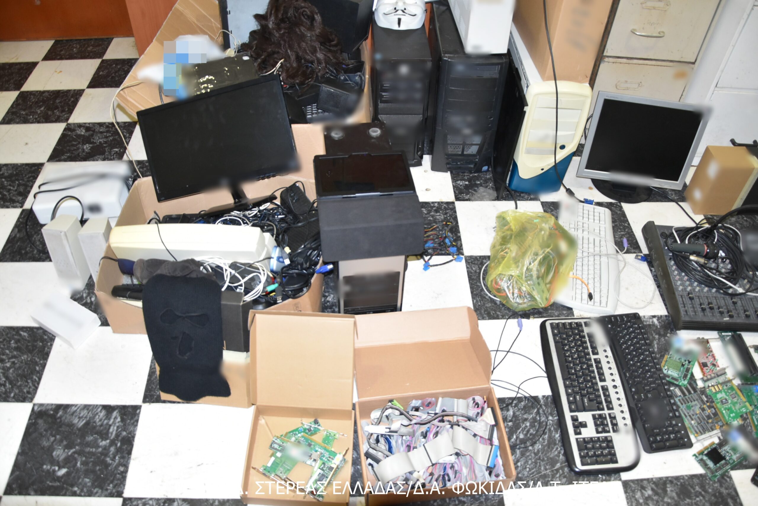 Ειδικότερα, μεταξύ άλλων, κατασχέθηκαν κεντρικές μονάδες Η/Υ, φορητοί Η/Υ (laptop), tablet, οθόνες Η/Υ, πλήθος περιφερειακών συσκευών – εξοπλισμού Η/Υ (ηχεία, «ποντίκια», πληκτρολόγια, ζεύγη ακουστικών, πλακέτες, τροφοδοτικά, κάμερες, εξωτερικοί σκληροί δίσκοι κ.λπ.), φορτιστές Η/Υ διαφόρων τύπων, πληθώρα καλωδίων διαφόρων τύπων και το χρηματικό ποσό των -610- ευρώ.