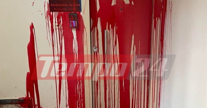 Άγνωστοι εξαπέλυσαν επίθεση με μπογιές στο πολικό γραφείο της βουλευτής Αχαΐας της ΝΔ Χριστίνας Αλεξοπούλου στην Πάτρα.