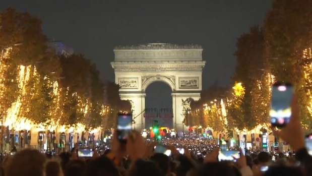 Τα δέντρα στη λεωφόρο των Ηλυσίων Πεδίων φωτίστηκαν με ένα εντυπωσιακό κύμα από πολύχρωμα λαμπιόνια, δημιουργώντας μία μαγευτική διαδρομή μέχρι την Αψίδα του Θριάμβου.