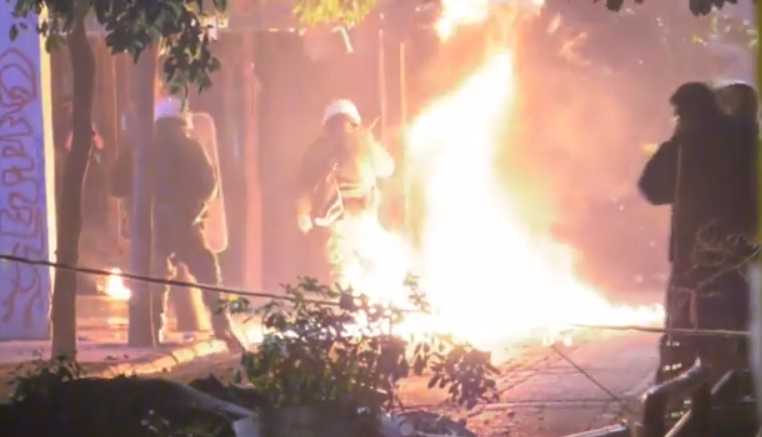 Ξεκινά κυνηγητό στα στενά των Εξαρχείων, με αντιεξουσιαστές να πετούν πέτρες αλλά και μολότοφ από ταράτσες πολυκατοικιών και να στήνουν οδοφράγματα.