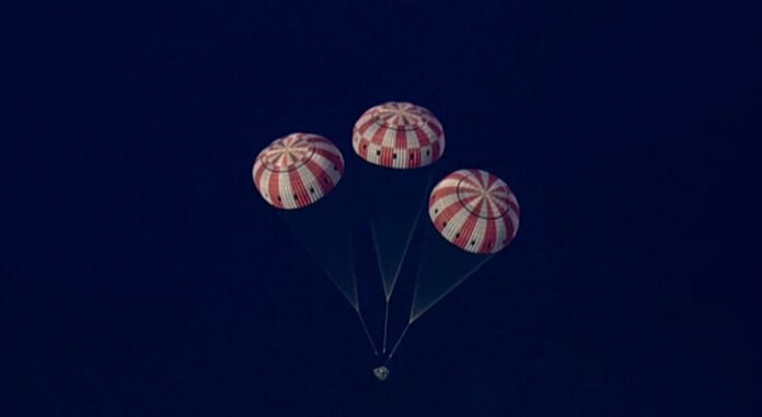 Η διαστημική άκατος προσθαλασσώθηκε χωρίς πρόβλημα, περίπου δύο χιλιόμετρα από το σημείο που προβλεπόταν στα ανοιχτά του Σαν Ντιέγκο της Καλιφόρνια στον Ειρηνικό, με τη βοήθεια τριών μεγάλων αλεξίπτωτων.