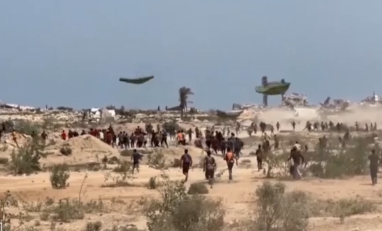 Εκατοντάδες εξαθλιωμένοι Παλαιστίνιοι τρέχουν να προλάβουν να πάρουν λίγα τρόφιμα βάζοντας σε κίνδυνο την ίδια τους την ζωή. Η πείνα τους ξεπερνά κάθε φόβο.