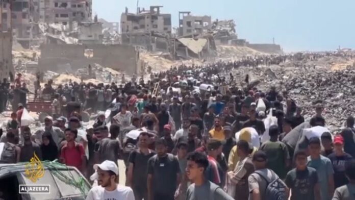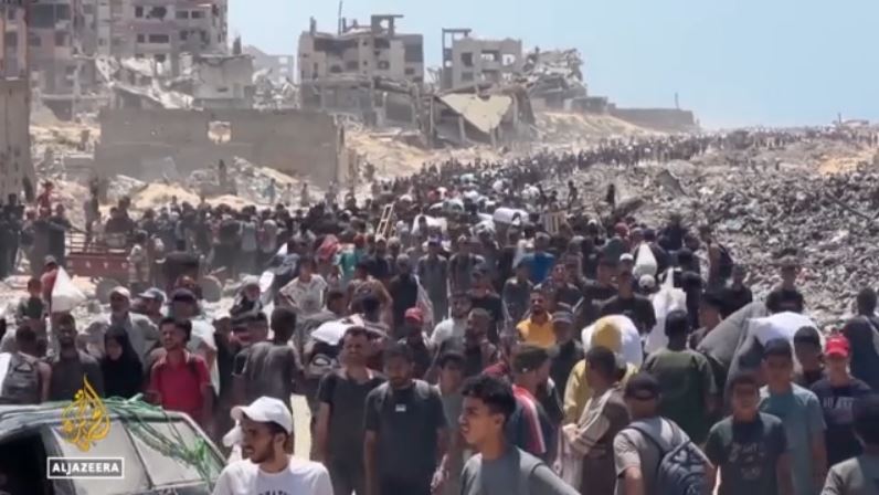 Χιλιάδες απελπισμένοι Παλαιστίνιοι τρέχουν προς σημείο όπου έχει μεταφερθεί ανθρωπιστική βοήθεια στη νότια Γάζα.
