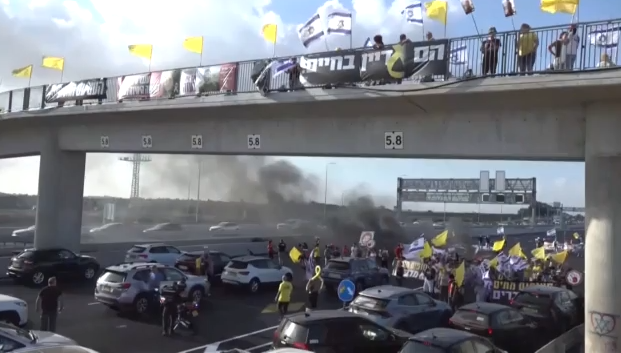 Με φωτιές από καμένα λάστιχα, πλακάτ και φωτογραφίες των ομήρων της Χαμάς, εκατοντάδες διαδηλωτές μπλοκάρουν δρόμους στο Τελ Αβίβ.