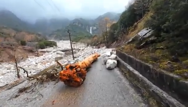 Βιβλική καταστροφή στον δρόμο για τους καταρράκτες της Άρτας, στα Τζουμέρκα. Μοτοσικλετιστής αντικρίζει τη σοκαριστική εικόνα, αυτήν που άφησε πίσω της η κακοκαιρία.