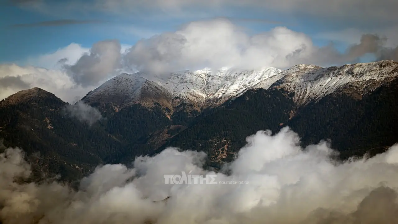 Ανήμερα των Χριστουγέννων, το χιόνι έκανε την εμφάνισή του κυρίως πάνω από τα 1.500 μέτρα, μεταμορφώνοντας το τοπίο και χαρίζοντας ένα καθαρό, σχεδόν εορταστικό περίγραμμα στο βουνό που αγκαλιάζει τον κάμπο του Αγρινίου.