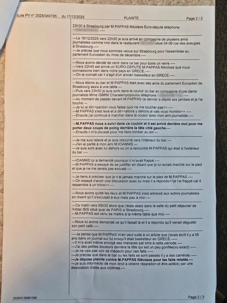 Με κάθε λεπτομέρεια περιγράφει στη μήνυσή του ο δημοσιογράφος του NEWS24/7 Νίκος Γιαννόπουλος την άγρια επίθεση που δέχθηκε από τον ευρωβουλευτή Νίκο Παππά στο Στρασβούργο.