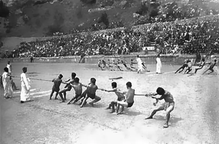 1927, Αρχαίο στάδιο -το αγώνισμα της διελκυστίνδας στις Δελφικές Εορτές. Ολυμπιακό άθλημα στις πρώτες σύγχρονες διοργανώσεις, μέχρι το 1920.