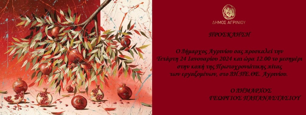 Την  Τετάρτη  24 Ιανουαρίου στις 12.00 στο ΔΗ.ΠΕ.ΘΕ. Αγρινίου θα πραγματοποιηθεί η εκδήλωση  κοπής της Βασιλόπιτας των εργαζομένων στο Δήμο Αγρινίου.