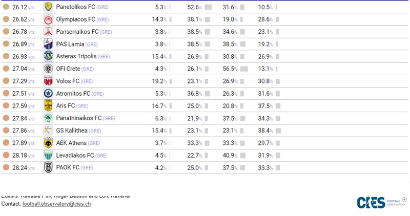 Αυτό αναφέρει η τελευταία έκθεση του CIES Football Observatory (διεθνές κέντρο αθλητικών ερευνών, που βρίσκεται στο Νοσατέλ της Ελβετίας και δημιουργήθηκε σε συνεργασία με τη FIFA), η οποία συγκρίνει συλλόγους σε 49 πρωταθλήματα σε όλο τον κόσμο σύμφωνα με τη μέση ηλικία στην οποία υπέγραψαν οι παίκτες στην τρέχουσα ομάδα τους (χωρίς να συμπεριλαμβάνονται οι απόφοιτοι ακαδημιών νέων).