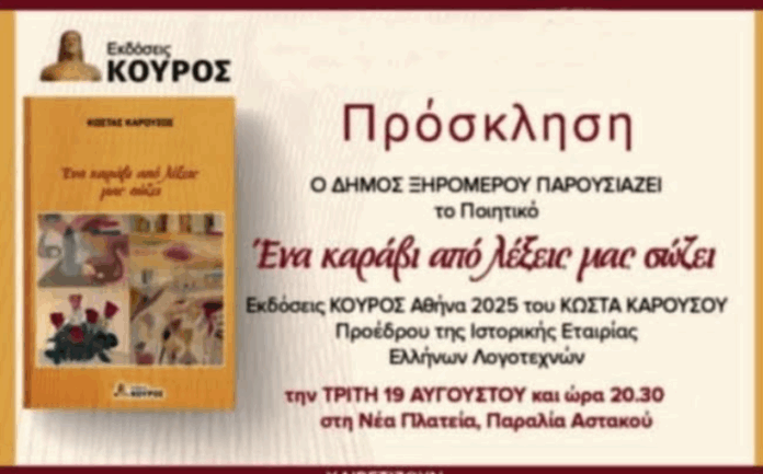 Εκδόσεις ΚΟΥΡΟΣ Αθήνα 2025 του ΚΩΣΤΑ ΚΑΡΟΥΣΟΥ, Προέδρου της Ιστορικής Εταιρίας Ελλήνων Λογοτεχνών την ΤΡΙΤΗ 19 ΑΥΓΟΥΣΤΟΥ και ώρα 20.30 στη Νέα Πλατεία, Παραλία Αστακού.