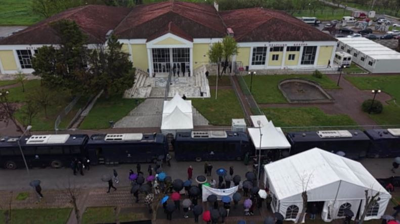 Εν μέσω κακοκαιρίας, συγγενείς θυμάτων στέκονται εκτεθειμένοι στη βροχή και αντιμέτωποι με τα αυστηρά μέτρα ασφαλείας. Αντιδρούν με τις συνθήκες διεξαγωγής της δίκης των Τεμπών. Ζητούν να μπουν στην αίθουσα όλοι οι συγγενείς των θυμάτων.