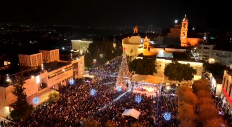 Η κεντρική πλατεία της Βηθλεέμ λούζεται στο φως. Χιλιάδες άνθρωποι ξεσπούν σε επιφωνήματα χαράς καθώς οι χριστουγεννιάτικες εκδηλώσεις επιστρέφουν στην πόλη της Δυτικής Όχθης.