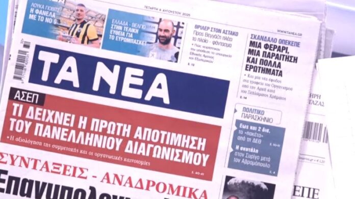Αρχική ΚΟΙΝΩΝΙΑ Τα πρωτοσέλιδα των εφημερίδων σήμερα ΚΟΙΝΩΝΙΑ Τα πρωτοσέλιδα των εφημερίδων σήμερα Από admin - 6 Αυγούστου 2025 FacebookTwitterPinterestWhatsApp Τι γράφουν οι εφημερίδες σήμερα 06/08/2025. Πηγή ΠΑΡΟΜΟΙΑ ΑΡΘΡΑΠΕΡΙΣΣΟΤΕΡΑ ΑΠΟ ΤΟΝ ΔΗΜΙΟΥΡΓΟ Δολοφονία Καρυώτη: «Μου δώσανε φράγκα για να ομολογήσω» – Ντοκουμέντο «βόμβα» μέσα από τις φυλακές Σαλαμίνα: Το νέο ηχητικό ντοκουμέντο προκαλεί ανατριχίλα Σαλαμίνα: Άγνωστες μαρτυρίες για τη δολοφονία της 75χρονης από τη νύφη της Καιρός: Στο έλεος της κακοκαιρίας «Byron» ολόκληρη η χώρα – Πλημμύρες & προβλήματα Καιρός: «Πνίγηκε» η δυτική Αττική από την κακοκαιρία «Byron» – Χείμαρροι οι δρόμοι, πλημμύρισαν σπίτια Κακοκαιρία Byron: «Σιντριβάνια» και πλημμύρες στην Καλλιθέα – «Βενετία» το Μοναστηράκι Ροή ειδήσεων Παύλος Κοντογιαννίδης για Αλέξη Τσίπρα: Γνωστός φέρελπις αποτυχημένος του παρελθόντος οραματιστής... 6 Δεκεμβρίου 2025 Δολοφονία Καρυώτη: «Μου δώσανε φράγκα για να ομολογήσω» – Ντοκουμέντο «βόμβα»... 6 Δεκεμβρίου 2025 Αγρίνιο: Τριήμερη διακοπή κυκλοφορίας σε τμήματα των οδών Εθνικής Αντιστάσεως και... 6 Δεκεμβρίου 2025 Σαλαμίνα: Το νέο ηχητικό ντοκουμέντο προκαλεί ανατριχίλα 6 Δεκεμβρίου 2025 Δεν καταγράφηκαν θανατηφόρα τροχαία το μήνα Νοέμβριο στη Δυτική Ελλάδα 6 Δεκεμβρίου 2025 Σαλαμίνα: Άγνωστες μαρτυρίες για τη δολοφονία της 75χρονης από τη νύφη... 6 Δεκεμβρίου 2025 Καιρός: Στο έλεος της κακοκαιρίας «Byron» ολόκληρη η χώρα – Πλημμύρες... 5 Δεκεμβρίου 2025 Σακελλαρίδης για Τσίπρα: Η κατάληξη θα είναι το νησί της Καλυψώς... 5 Δεκεμβρίου 2025 Καιρός: «Πνίγηκε» η δυτική Αττική από την κακοκαιρία «Byron» – Χείμαρροι... 5 Δεκεμβρίου 2025