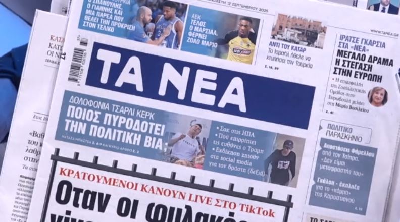Αρχική ΚΟΙΝΩΝΙΑ Τα πρωτοσέλιδα των εφημερίδων σήμερα ΚΟΙΝΩΝΙΑ Τα πρωτοσέλιδα των εφημερίδων σήμερα Από admin - 12 Σεπτεμβρίου 2025 FacebookTwitterPinterestWhatsApp Τι γράφουν οι εφημερίδες σήμερα 12/09/2025. Πηγή ΠΑΡΟΜΟΙΑ ΑΡΘΡΑΠΕΡΙΣΣΟΤΕΡΑ ΑΠΟ ΤΟΝ ΔΗΜΙΟΥΡΓΟ Καιρός: Οδοιπορικό του MEGA στη Μάνδρα μετά το πέρασμα του «Byron» Δείτε βίντεο: Με δάκρυα στα μάτια αποχαιρετά κτηνοτρόφος τα 450 πρόβατά του, όλα ντόπιας ιστορικής φυλής Καιρός: «Πνίγηκε» η δυτική Αττική από τον «Byron» – Χείμαρροι οι δρόμοι, πλημμύρισαν σπίτια Ζάκυνθος: Νεκρό παιδί 18 μηνών από επίθεση σκύλου Ανθρωποκυνηγητό για τον εντοπισμό των «τιμωρών παιδόφιλων» – Η δράση της συμμορίας Θάσος: Η στιγμή που 50χρονη αναζητά καταφύγιο πριν την επίθεση από τον πρώην σύζυγό της – MEGA ντοκουμέντο Ροή ειδήσεων Καιρός: Οδοιπορικό του MEGA στη Μάνδρα μετά το πέρασμα του «Byron» 6 Δεκεμβρίου 2025 Ενισχύονται οι αμερικανικές στρατιωτικές δυνάμεις ανοιχτά της Βενεζουέλας 6 Δεκεμβρίου 2025 Δείτε βίντεο: Με δάκρυα στα μάτια αποχαιρετά κτηνοτρόφος τα 450 πρόβατά... 6 Δεκεμβρίου 2025 Καιρός: «Πνίγηκε» η δυτική Αττική από τον «Byron» – Χείμαρροι οι... 6 Δεκεμβρίου 2025 Ζάκυνθος: Νεκρό παιδί 18 μηνών από επίθεση σκύλου 6 Δεκεμβρίου 2025 Εύκολο απόγευμα για τον Παναγρινιακό… 4-1 το Άρωμα Βαρετάδας (φωτο) 6 Δεκεμβρίου 2025 Μητσοτάκης: Η ανάρτηση για την ανασκόπηση του 2025 – «Έτος με... 6 Δεκεμβρίου 2025 Ανθρωποκυνηγητό για τον εντοπισμό των «τιμωρών παιδόφιλων» – Η δράση της... 6 Δεκεμβρίου 2025 Θάσος: Η στιγμή που 50χρονη αναζητά καταφύγιο πριν την επίθεση από... 6 Δεκεμβρίου 2025
