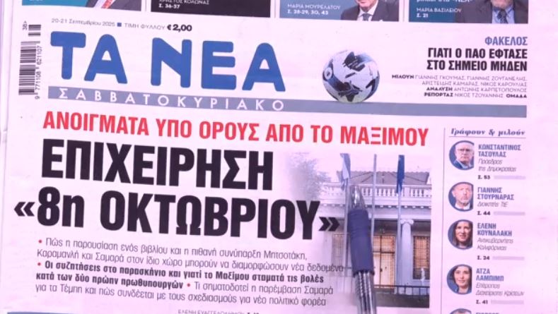 Αρχική ΚΟΙΝΩΝΙΑ Τα πρωτοσέλιδα των εφημερίδων σήμερα ΚΟΙΝΩΝΙΑ Τα πρωτοσέλιδα των εφημερίδων σήμερα Από admin - 20 Σεπτεμβρίου 2025 FacebookTwitterPinterestWhatsApp Τι γράφουν οι εφημερίδες σήμερα 20/09/2025. Πηγή ΠΑΡΟΜΟΙΑ ΑΡΘΡΑΠΕΡΙΣΣΟΤΕΡΑ ΑΠΟ ΤΟΝ ΔΗΜΙΟΥΡΓΟ Κακοκαιρία: Νύχτα αγωνίας στην Θεσσαλία εξαιτίας της υπερχείλισης του ποταμού Ενιπέα – Καταστροφές σε όλη τη χώρα Κλιμακώνονται οι αγροτικές κινητοποιήσεις – Νέο μπλόκο στις Μικροθήβες Μαγνησίας Μαλακάσα: Οδηγός χάνει τον έλεγχο του ΙΧ του λόγω κακοκαιρίας και έπεσε σε προστατευτικές μπάρες – Βίντεο σοκ Εκδηλώσεις μνήμης σε όλη τη χώρα για την δολοφονία του Αλέξανδρου Γρηγορόπουλου Τα πρωτοσέλιδα των εφημερίδων σήμερα Νύχτα αποκαλύψεων στο «Φως στο Τούνελ» Ροή ειδήσεων Κακοκαιρία: Νύχτα αγωνίας στην Θεσσαλία εξαιτίας της υπερχείλισης του ποταμού Ενιπέα... 6 Δεκεμβρίου 2025 ΗΠΑ: Η Μελάνια Τραμπ άναψε το «εθνικό» χριστουγεννιάτικο δέντρο 6 Δεκεμβρίου 2025 Κυριάκος Μητσοτάκης στο ΚΥ Μαρκόπουλου: Υλοποιείται το μεγαλύτερο πρόγραμμα αναβάθμισης κτιρίων... 6 Δεκεμβρίου 2025 Κλιμακώνονται οι αγροτικές κινητοποιήσεις – Νέο μπλόκο στις Μικροθήβες Μαγνησίας 6 Δεκεμβρίου 2025 Ντόναλντ Τραμπ: Ενισχύει τις στρατιωτικές δυνάμεις ανοιχτά της Βενεζουέλας 6 Δεκεμβρίου 2025 Κώστας Τσιάρας προς αγρότες: «Κανένα αίτημα για συνάντηση δεν έχει απορριφθεί» 6 Δεκεμβρίου 2025 Μαλακάσα: Οδηγός χάνει τον έλεγχο του ΙΧ του λόγω κακοκαιρίας και... 6 Δεκεμβρίου 2025 Κυριάκος Μητσοτάκης: Είμαστε ανοιχτοί σε διάλογο με τους αγρότες 6 Δεκεμβρίου 2025 Εκδηλώσεις μνήμης σε όλη τη χώρα για την δολοφονία του Αλέξανδρου... 6 Δεκεμβρίου 2025