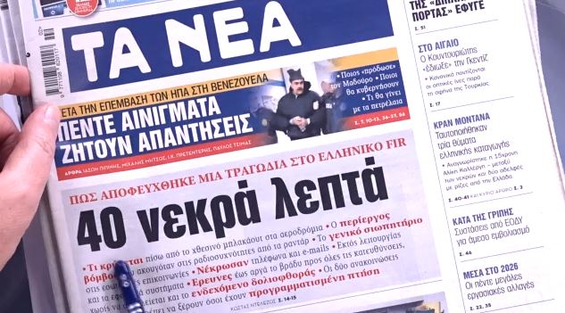 Αρχική ΚΟΙΝΩΝΙΑ Τα πρωτοσέλιδα των εφημερίδων σήμερα ΚΟΙΝΩΝΙΑ Τα πρωτοσέλιδα των εφημερίδων σήμερα Από admin - 5 Ιανουαρίου 2026 FacebookTwitterPinterestWhatsApp Τι γράφουν οι εφημερίδες σήμερα 05/12/2026. Πηγή ΠΑΡΟΜΟΙΑ ΑΡΘΡΑΠΕΡΙΣΣΟΤΕΡΑ ΑΠΟ ΤΟΝ ΔΗΜΙΟΥΡΓΟ «Σάλος» με γυναίκα αστυνομικό που πυροβολεί στον αέρα με το όπλο της – Είχε καταγγείλει στο παρελθόν τον σύντροφό της για ξυλοδαρμό «Κόβεται στα δύο» η χώρα – Κλείνουν όλους τους δρόμους οι αγρότες «Σάλος» με γυναίκα αστυνομικό που πυροβολεί στον αέρα με το όπλο της – Είχε καταγγείλει στο παρελθόν τον σύντροφό της για ενδοοικογενειακή βία Τα πρωτοσέλιδα των εφημερίδων σήμερα Στα άκρα η κόντρα κυβέρνησης – αγροτών μετά την εξειδίκευση των μέτρων – Ετοιμάζουν 48ωρο «μπλακ άουτ» Σέρρες: Δίωξη για ανθρωποκτονία από πρόθεση σε βάρος του 16χρονου – Ξυλοκόπησε μέχρι θανάτου 17χρονο για ένα sms Ροή ειδήσεων ΠΑΣΟΚ: Φουλ επίθεση στη ΝΔ και στο βάθος Καρυστιανού 8 Ιανουαρίου 2026 «Σάλος» με γυναίκα αστυνομικό που πυροβολεί στον αέρα με το όπλο... 8 Ιανουαρίου 2026 «Κόβεται στα δύο» η χώρα – Κλείνουν όλους τους δρόμους οι... 8 Ιανουαρίου 2026 «Σάλος» με γυναίκα αστυνομικό που πυροβολεί στον αέρα με το όπλο... 8 Ιανουαρίου 2026 Τα πρωτοσέλιδα των εφημερίδων σήμερα 8 Ιανουαρίου 2026 Το πρώτο crash test Δικαιοσύνης και αστυνομίας με τους αγρότες στα... 8 Ιανουαρίου 2026 Φαραντούρης για κόμμα Καρυστιανού: Άλλοι έσπευσαν να δηλώσουν συμπόρευση σε κόμματα... 8 Ιανουαρίου 2026 Ο Νίκος Δένδιας προανήγγειλε θετικές αλλαγές για τους υπαξιωματικούς στο νομοσχέδιο... 8 Ιανουαρίου 2026 Ακραίο το αποτύπωμά του Τσάβες στον Παναιτωλικό, έσωσε σχεδόν 17 γκολ... 8 Ιανουαρίου 2026