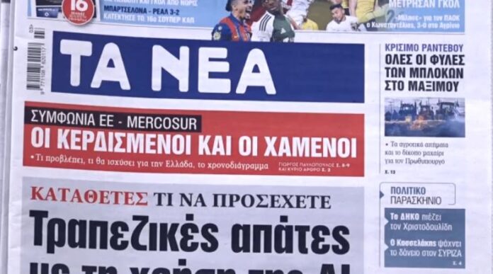 Αρχική ΚΟΙΝΩΝΙΑ Τα πρωτοσέλιδα των εφημερίδων σήμερα ΚΟΙΝΩΝΙΑ Τα πρωτοσέλιδα των εφημερίδων σήμερα Από admin - 12 Ιανουαρίου 2026 FacebookTwitterPinterestWhatsApp Τι γράφουν οι εφημερίδες σήμερα 12/01/2026. Πηγή ΠΑΡΟΜΟΙΑ ΑΡΘΡΑΠΕΡΙΣΣΟΤΕΡΑ ΑΠΟ ΤΟΝ ΔΗΜΙΟΥΡΓΟ Αύριο η κρίσιμη συνάντηση της αντιπροσωπείας των αγροτών με τον πρωθυπουργό στο Μαξίμου Online κάλεσμα για σούζες και κόντρες στη Λεωφόρο Αθηνών – 3 συλλήψεις Αεροδρόμιο Ελ. Βενιζέλος: Συνελήφθησαν 3 γυναίκες που μετέφεραν 71 κιλά κάνναβη στις βαλίτσες τους Κηφισιά: Απατεώνες άρπαξαν κοσμήματα αξίας 500.000 ευρώ από ηλικιωμένο ζευγάρι Φοινικούντα: Συμπληρωματικές απολογίες δίνουν την Τετάρτη οι 2 νεαροί εκτελεστές του επιχειρηματία Αλεξανδρούπολη: Εικόνες σοκ από το σαρωτικό πέρασμα ανεμοστρόβιλου – Βίντεο ντοκουμέντο Ροή ειδήσεων Αύριο η κρίσιμη συνάντηση της αντιπροσωπείας των αγροτών με τον πρωθυπουργό... 12 Ιανουαρίου 2026 Online κάλεσμα για σούζες και κόντρες στη Λεωφόρο Αθηνών – 3... 12 Ιανουαρίου 2026 Αεροδρόμιο Ελ. Βενιζέλος: Συνελήφθησαν 3 γυναίκες που μετέφεραν 71 κιλά κάνναβη... 12 Ιανουαρίου 2026 Το ΠΑΣΟΚ στο πλευρό των αγροτών με το βλέμμα στη συνάντηση... 12 Ιανουαρίου 2026 Μέγαρο Μαξίμου για Μαρία Καρυστιανού: Αλλαγή στάσης και μήνυμα Μητσοτάκη για... 12 Ιανουαρίου 2026 Κηφισιά: Απατεώνες άρπαξαν κοσμήματα αξίας 500.000 ευρώ από ηλικιωμένο ζευγάρι 12 Ιανουαρίου 2026 Φοινικούντα: Συμπληρωματικές απολογίες δίνουν την Τετάρτη οι 2 νεαροί εκτελεστές του... 12 Ιανουαρίου 2026 Αλεξανδρούπολη: Εικόνες σοκ από το σαρωτικό πέρασμα ανεμοστρόβιλου – Βίντεο ντοκουμέντο 12 Ιανουαρίου 2026 Κακοκαιρία: Στα λευκά «ντύθηκαν» πολλές περιοχές της χώρας – Πολικές θερμοκρασίες... 12 Ιανουαρίου 2026