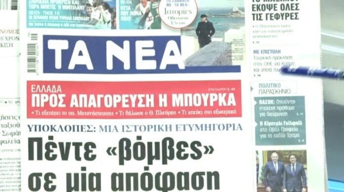 Αρχική ΚΟΙΝΩΝΙΑ Τα πρωτοσέλιδα των εφημερίδων σήμερα ΚΟΙΝΩΝΙΑ Τα πρωτοσέλιδα των εφημερίδων σήμερα Από admin - 27 Φεβρουαρίου 2026 FacebookTwitterPinterestWhatsApp Τι γράφουν οι εφημερίδες σήμερα 27/02/2026. Πηγή ΠΑΡΟΜΟΙΑ ΑΡΘΡΑΠΕΡΙΣΣΟΤΕΡΑ ΑΠΟ ΤΟΝ ΔΗΜΙΟΥΡΓΟ Παύλος Ασλανίδης: «Θα “σπρώξουμε” τη Δικαιοσύνη να κάνει αυτό που πρέπει για τα Τέμπη» – Τι είπε για Καρυστιανού Χαλκιδική: Εντοπίστηκαν ανθρώπινα μέλη μέσα σε σακούλες δίπλα σε βαλίτσα στο Πευκοχώρι Ματίνα Παγώνη για Ζάκυνθο: «Δεν έχουμε θανάτους από ιογενή μηνιγγίτιδα – Από φωτογραφίες δεν μπορούμε να βγάζουμε διαγνώσεις» Ρούλα Πισπιρίγκου: Ζητεί να αποφυλακιστεί με βραχιολάκι λόγω αυτοάνοσου Θλίψη στον δημοσιογραφικό κόσμο: «Έφυγε» από τη ζωή η Αντιγόνη Πανέλλη σε ηλικία 57 ετών «Κάποιοι ήθελαν νέα Τέμπη» – Καταγγελία Κυρανάκη για δολιοφθορά σε καλώδια τηλεδιοίκησης Ροή ειδήσεων Παύλος Ασλανίδης: «Θα “σπρώξουμε” τη Δικαιοσύνη να κάνει αυτό που πρέπει... 27 Φεβρουαρίου 2026 Live: Ανδρουλάκης σε Μητσοτάκη στη Βουλή για τις υποκλοπές: «Εμπιστεύομαι τη... 27 Φεβρουαρίου 2026 Χαλκιδική: Εντοπίστηκαν ανθρώπινα μέλη μέσα σε σακούλες δίπλα σε βαλίτσα στο... 27 Φεβρουαρίου 2026 Στη Βουλή ο Ανδρουλάκης με την απόφαση για τις υποκλοπές στην... 27 Φεβρουαρίου 2026 Ματίνα Παγώνη για Ζάκυνθο: «Δεν έχουμε θανάτους από ιογενή μηνιγγίτιδα –... 27 Φεβρουαρίου 2026 «Αγεφύρωτο το χάσμα» ανάμεσα σε Σαμαρά και Μητσοτάκη με φόντο την... 27 Φεβρουαρίου 2026 Ρούλα Πισπιρίγκου: Ζητεί να αποφυλακιστεί με βραχιολάκι λόγω αυτοάνοσου 27 Φεβρουαρίου 2026 Θλίψη στον δημοσιογραφικό κόσμο: «Έφυγε» από τη ζωή η Αντιγόνη Πανέλλη... 27 Φεβρουαρίου 2026 «Κάποιοι ήθελαν νέα Τέμπη» – Καταγγελία Κυρανάκη για δολιοφθορά σε καλώδια... 27 Φεβρουαρίου 2026