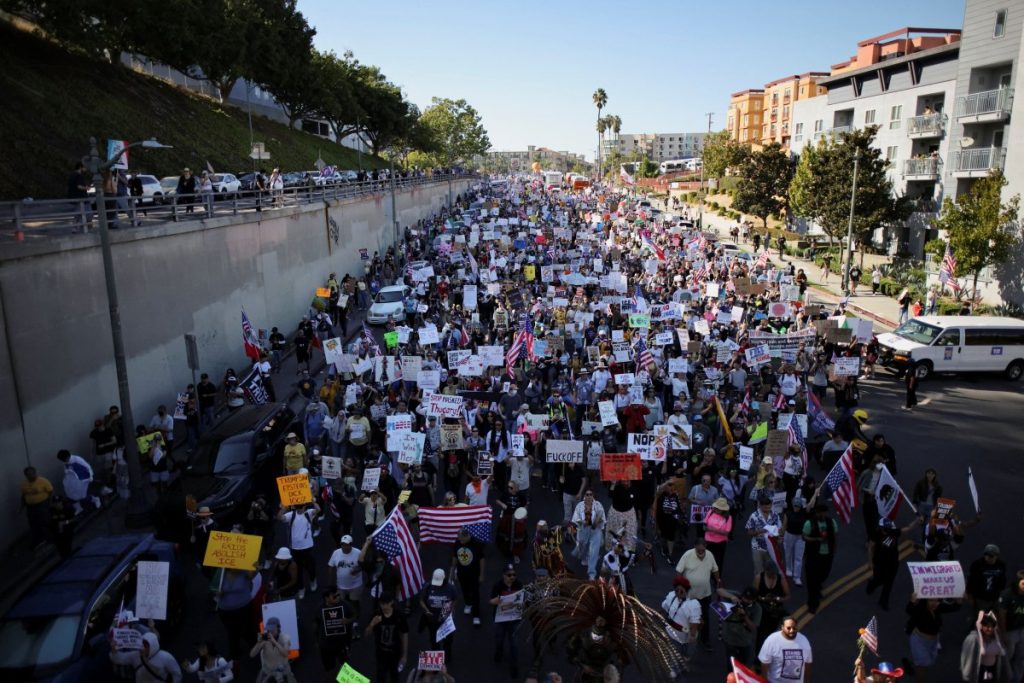 Με κεντρικό σύνθημα «Όχι Βασιλιάδες» διαμαρτυρήθηκαν για την μεταναστευτική πολιτική του Ντόναλντ Τραμπ, τις εφόδους αστυνομικών της Ομοσπονδιακής Υπηρεσίας Μετανάστευσης και την ανάπτυξη της εθνοφρουράς.