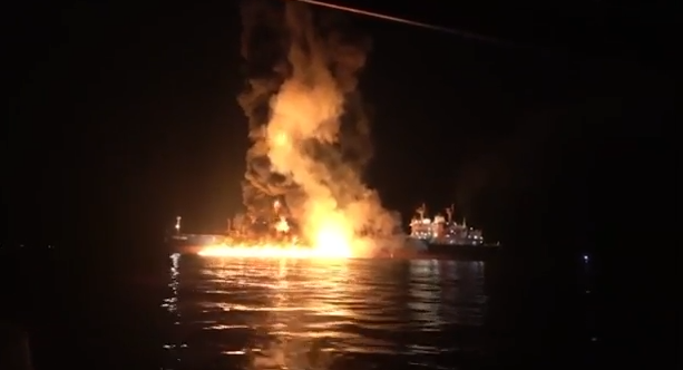 Μετά το χτύπημα μέσα σε κλάσματα δευτερολέπτου το Safesea τυλίγεται στις φλόγες. Δίπλα του βρίσκεται το ελληνόκτητο πλοίο Zefyros που παίρνει και αυτό φωτιά.