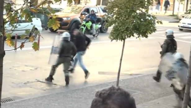 Ομάδα ατόμων με καλυμμένα τα χαρακτηριστικά κινήθηκε, από την οδό 26ης Οκτωβρίου, προς την είσοδο των Δικαστηρίων, εκσφενδονίζοντας αντικείμενα στα ΜΑΤ.
