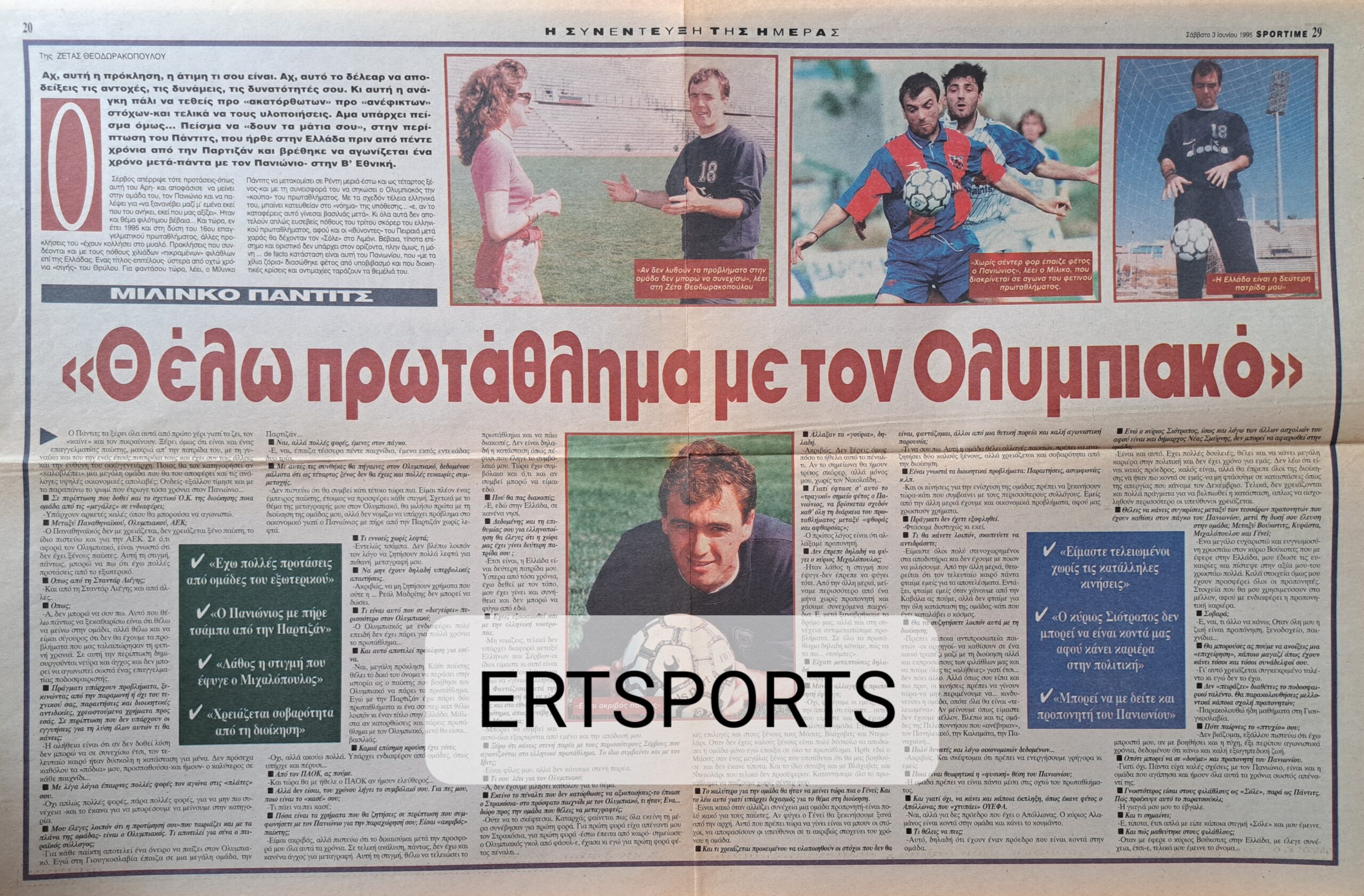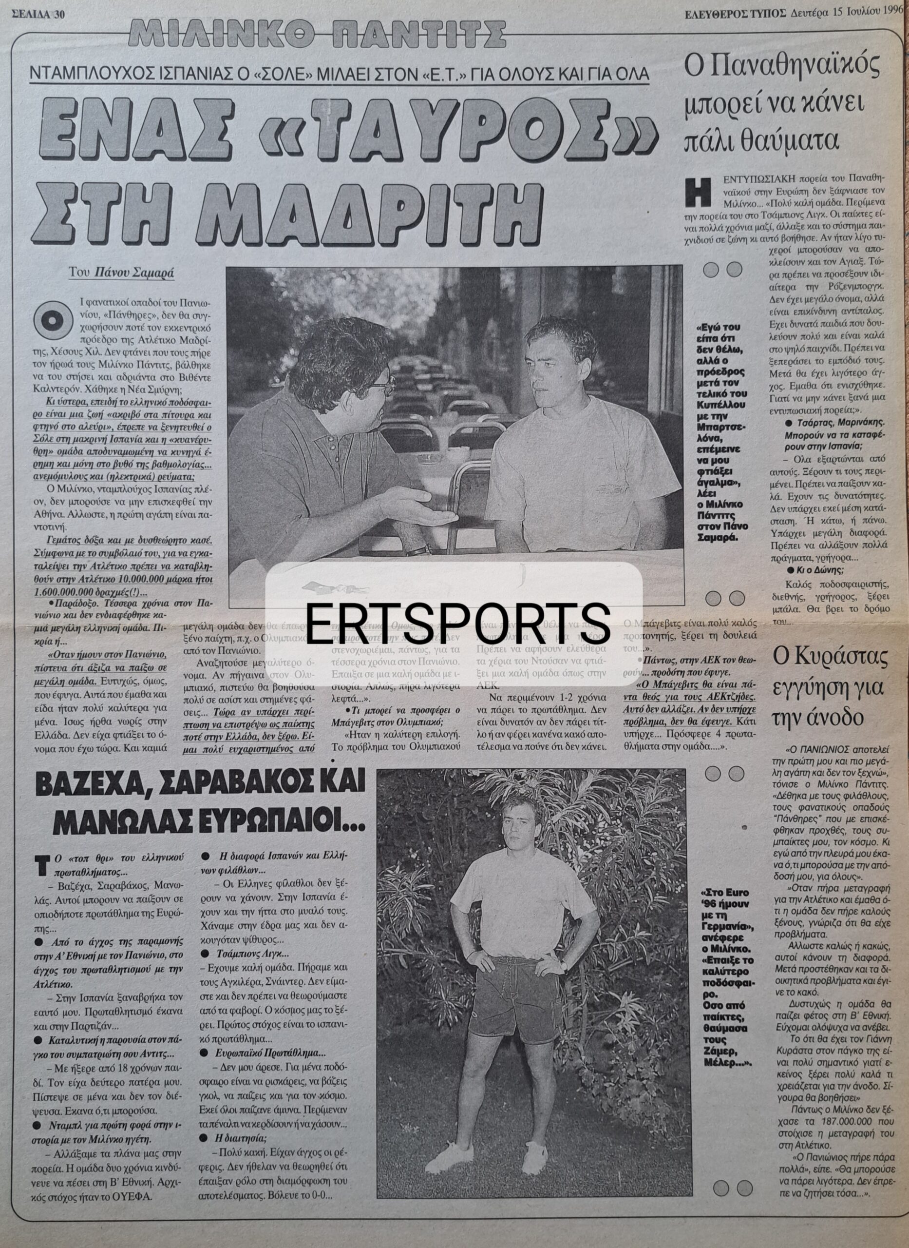 Ο Πανιώνιος άλλωστε είναι ομάδα που συχνά τροφοδοτούσε το ΠΟΚ με αξιόλογους ποδοσφαιριστές. Νεστορίδης, Μαύρος, Δέδες στην ΑΕΚ. Παπουλίδης, Σαραβάκος, Μαραγκός στον Παναθηναϊκό. Αναστόπουλος, Τσιαντάκης στον Ολυμπιακό. Με τον Πάντιτς αυτό δεν προέκυψε, αν και οι «ερυθρόλευκοι» τον… παρακολουθούσαν, έχοντας σύμμαχο και τον ίδιο τον ποδοσφαιριστή που σε συνέντευξή του στη Ζέτα Θεοδωρακοπούλου τον Ιούνιο του 1995, αποκάλυπτε: «Θέλω να κατακτήσω Πρωτάθλημα με τον Ολυμπιακό. Έχω αρκετές προτάσεις από το εξωτερικό, αλλά για κάθε ποδοσφαιριστή αποτελεί όνειρο να παίξει στον Ολυμπιακό». Ξεκάθαρο… άνοιγμα του «Σόλε» προς τους «ερυθρόλευκους» που καθυστέρησαν χαρακτηριστικά και τους πρόλαβε ο νέος προπονητής της Ατλέτικο Μαδρίτης Ράντομιρ Άντιτς, που πρόσφερε τη μεγάλη ευκαιρία στον Μίλινκο…