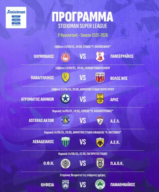 Ανακοινώθηκε από την Stoiximan Super League το πρόγραμμα της τρίτης αγωνιστικής του πρωταθλήματος.