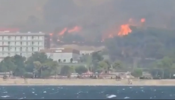 Ντόπιοι και τουρίστες εγκαταλείπουν όπως όπως τα Δαρδανέλια με βάρκες, καθώς οι φλόγες πλησιάζουν απειλητικά και έχουν φτάσει μέχρι την θάλασσα.