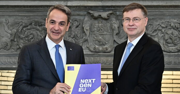 O πρωθυπουργός Κυριάκος Μητσοτάκης με τον Ευρωπαίο Επίτροπο Βάλντις Ντομπρόβσκις / ΜΙΧΑΛΗΣ ΚΑΡΑΓΙΑΝΝΗΣ/EUROKINISSI