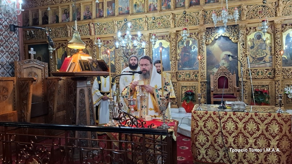 Κατά την Θεία Λειτουργία που τελέστηκε στον σολέα του Ναού, ο Σεβασμιώτατος επεξηγούσε με απλά λόγια τα βασικά σημεία και τους συμβολισμούς του Ιερού Μυστηρίου, με σκοπό οι μαθητές να μπορούν να κατανοούν τα τελούμενα και να συμμετέχουν καλύτερα σε αυτά.